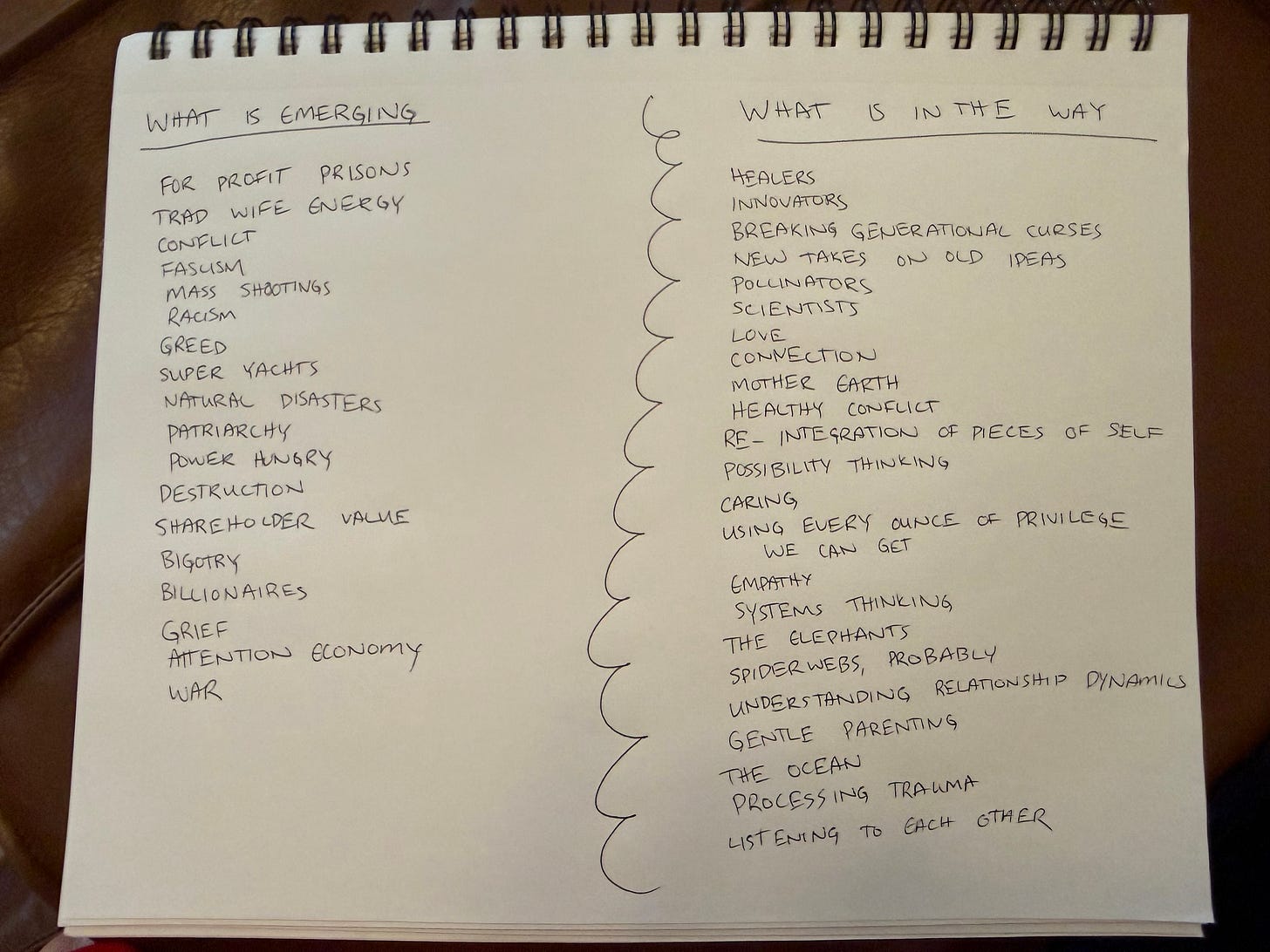 Everyone else drew hopeful, growing things for “what is emerging”—sprouts, new communities, green shoots of change. I didn’t. Without really thinking, I started writing and sketching all the bad stuff.